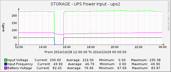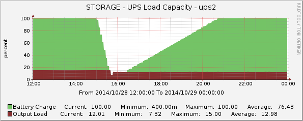 Bushi Posted October 29, 2014 Author Posted October 29, 2014 Тестируем SNR-UPS-ONRT при нагрузке 15%. Время работы на батареях до перехода в состояние LB (low battery) составило 41 минуту, при этом почему-то отвалился один потребитель, а все остальные продолжали работать (видно на графике - падение нагрузки). Видимо, состояние LB нельзя использовать как сигнал для отключения серверов, делать надо это раньше, ориентируясь на время работы или уровень заряда. При пропадании питания в сети уровень заряда батарей на дисплее скачком меняется со 100% до 60% (видимо для расчета уровня заряда просто использует напряжение батареи без учета нагрузки), драйвер blazer_usb уровень заряда и оставшееся время работы считает правильнее. Вопрос к SNR Team - есть ли смысл покупать SNR-UPS-ODC? Будет ли это устройство сообщать параметры charge и runtime? Вставить ник Quote