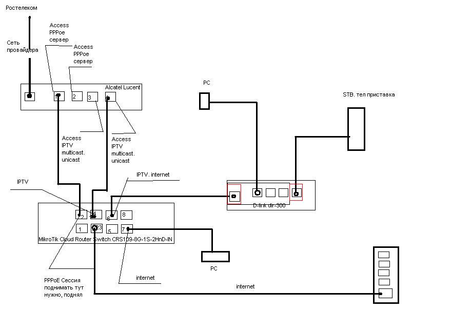 NikAlexAn Posted October 28, 2014 Posted October 28, 2014 Нужен совет по настройке Mikrotik. Поднимаю сессию PPPoE через 2 порт на Mikrotik. IPTV сервер от провайдера подключен к 4 порту на Mikrotik. Необходимо вывести на 6 порт и интернет и IPTV. Как реализовать это через vlan? Думал сделать target port 6 с определенным vlan и также пустить нетэгированный трафик интернет через 6 порт. В результате интернет работает, а по данному Vlan не проходят запросы от сервера IPTV. При подключении к 4 порту на Alcatel ПКашника ip addres получает. Так же если подключить к 4 порту на mikrotik dchp сервера по заданному vlan идет присвоение адресов STB приставки от подключенного DCHp сервера. Помоги с реализацией. Похожие темы смотрел не нашел их применение в своей схеме. Схему прикладываю. Заранее спасибо за помощь А что мешает инет и тв прогнать в разных вланах до дир100? Вставить ник Quote
