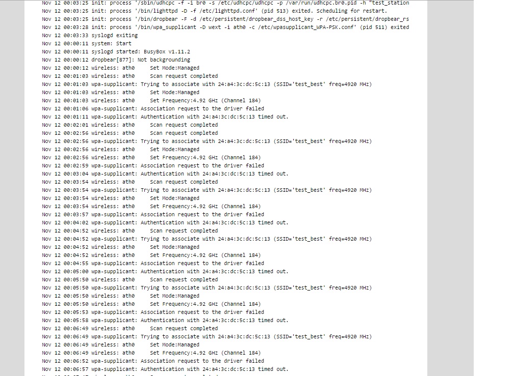 svosch Posted November 13, 2014 Posted November 13, 2014 (edited) Доброго времени суток. Ранее у меня уже был опыт настройки нанобридж и особых проблем я не встретил на пути настройки их , а тут приобрел nanobeam m5 2шт и не получается настроить мост , прошивку не трогаю так как компил тест пропадет). Проблема такая : со станции вижу точку доступа и выбираю её , но она даже на неё не встает при убранном шифровании Nov 12 00:00:11 system: Start Nov 12 00:00:11 syslogd started: BusyBox v1.11.2 Nov 12 00:00:12 FileSystem: Start check... Nov 12 00:00:12 dropbear[510]: Not backgrounding Nov 12 00:00:15 FileSystem: End check. Nov 12 00:04:22 wireless: ath0 Scan request completed а при шифровании wpa2 пишет: wpa-supplicant: Association request to the driver failed настраиваю две пушки рядышком, без всякого расстояния РЕБЯТ, ПОМОГИТЕ МОЖЕТ КТО СТАЛКИВАЛСЯ С ТАКОЙ ПРОБЛЕМОЙ. Edited November 13, 2014 by svosch Вставить ник Quote