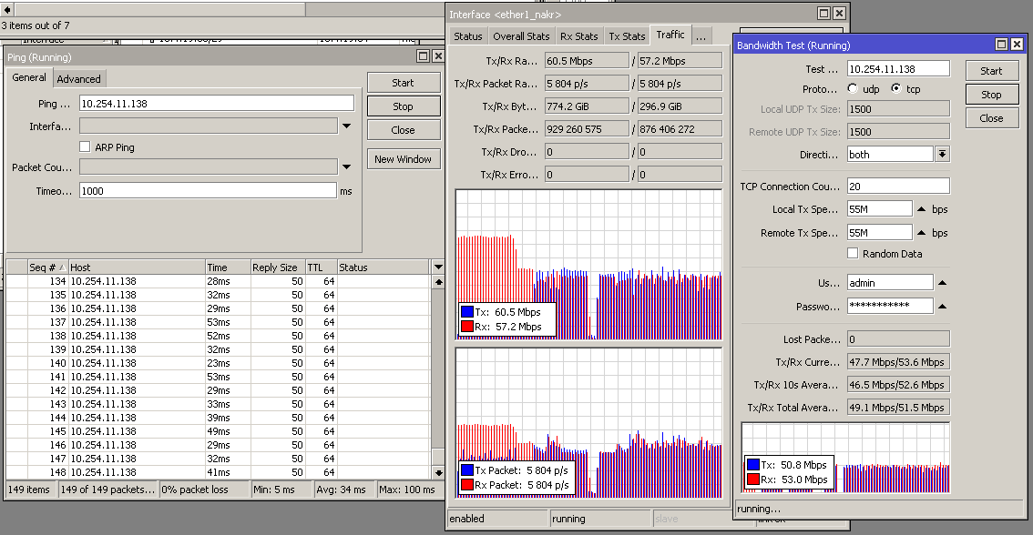 slv700 Posted November 17, 2014 Posted November 17, 2014 А вот так внешним iperf в UDP. iperf -c ip -u -t 60 -i 5 -b 20M -P 10 iperf -s -u ------------------------------------------------------------ Server listening on UDP port 5001 Receiving 1470 byte datagrams UDP buffer size: 116 KByte (default) ------------------------------------------------------------ [ ID] Interval Transfer Bandwidth Jitter Lost/Total Datagrams [ 14] 0.0-60.1 sec 39.7 MBytes 5.54 Mbits/sec 1.255 ms 5838/34138 (17%) [ ID] Interval Transfer Bandwidth Jitter Lost/Total Datagrams [ 12] 0.0-60.0 sec 43.4 MBytes 6.06 Mbits/sec 1.396 ms 4976/35941 (14%) [ ID] Interval Transfer Bandwidth Jitter Lost/Total Datagrams [ 5] 0.0-60.0 sec 43.7 MBytes 6.10 Mbits/sec 1.428 ms 4944/36096 (14%) [ ID] Interval Transfer Bandwidth Jitter Lost/Total Datagrams [ 7] 0.0-60.0 sec 43.3 MBytes 6.05 Mbits/sec 1.746 ms 5097/36011 (14%) [ ID] Interval Transfer Bandwidth Jitter Lost/Total Datagrams [ 6] 0.0-60.0 sec 44.0 MBytes 6.15 Mbits/sec 1.597 ms 4938/36359 (14%) [ ID] Interval Transfer Bandwidth Jitter Lost/Total Datagrams [ 8] 0.0-60.1 sec 39.5 MBytes 5.51 Mbits/sec 2.101 ms 5761/33922 (17%) [ ID] Interval Transfer Bandwidth Jitter Lost/Total Datagrams [ 9] 0.0-60.0 sec 39.3 MBytes 5.49 Mbits/sec 2.122 ms 6115/34125 (18%) [ ID] Interval Transfer Bandwidth Jitter Lost/Total Datagrams [ 10] 0.0-60.1 sec 39.9 MBytes 5.57 Mbits/sec 1.332 ms 5736/34164 (17%) [ ID] Interval Transfer Bandwidth Jitter Lost/Total Datagrams [ 11] 0.0-60.1 sec 39.8 MBytes 5.55 Mbits/sec 1.506 ms 5772/34131 (17%) [ ID] Interval Transfer Bandwidth Jitter Lost/Total Datagrams [ 13] 0.0-60.1 sec 43.6 MBytes 6.10 Mbits/sec 0.986 ms 5005/36138 (14%) [sUM] 0.0-60.1 sec 416 MBytes 58.1 Mbits/sec И какая скорость живого трафика была при этом тесте? И это в ту же сторону, куда встроенный дает 89М + 10 живого трафика?