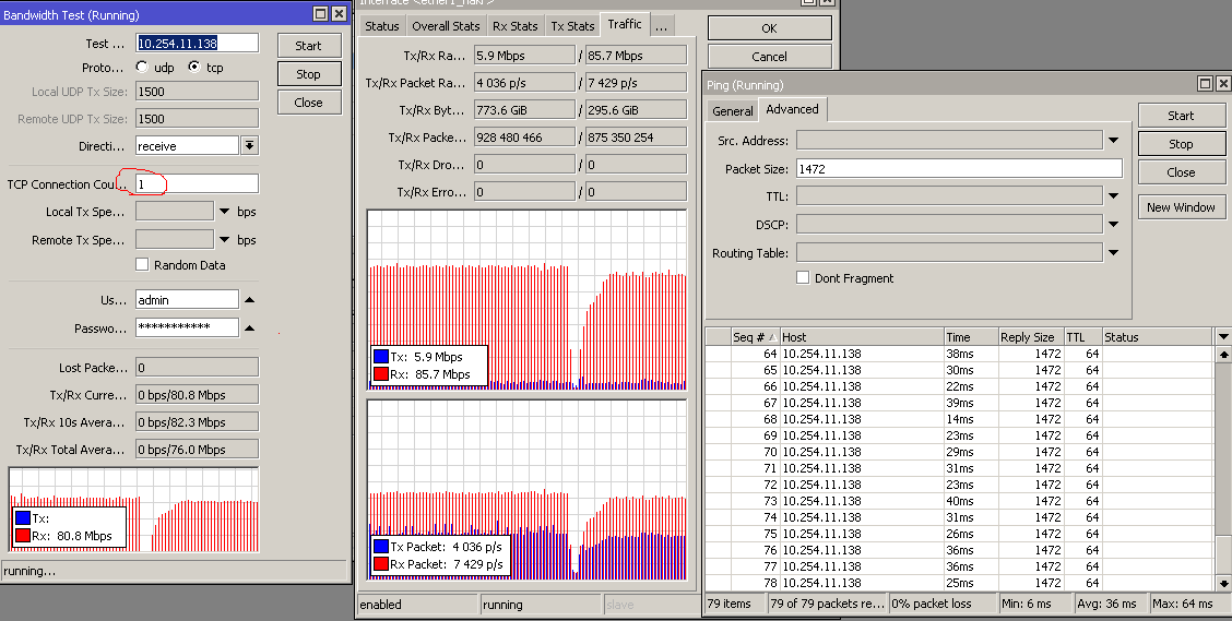 kosmich7 Posted November 18, 2014 Author Posted November 18, 2014 Сделайте тесты UDP одним большим потоком, чтобы потерь было не больше 3-5%. Тогда необходимо ограничить на уровне ~70Мбит iperf -c 192.168.1.2 -u -t 60 -i 5 -b 70M -P 1 ------------------------------------------------------------ Client connecting to 192.168.1.2, UDP port 5001 Sending 1470 byte datagrams UDP buffer size: 9.00 KByte (default) ------------------------------------------------------------ [ 3] local 192.168.1.25 port 30043 connected with 192.168.1.2 port 5001 [ ID] Interval Transfer Bandwidth [ 3] 0.0- 5.0 sec 41.7 MBytes 70.0 Mbits/sec [ 3] 5.0-10.0 sec 41.7 MBytes 70.0 Mbits/sec [ 3] 10.0-15.0 sec 41.7 MBytes 70.0 Mbits/sec [ 3] 15.0-20.0 sec 41.7 MBytes 70.0 Mbits/sec [ 3] 20.0-25.0 sec 41.7 MBytes 70.0 Mbits/sec [ 3] 25.0-30.0 sec 41.7 MBytes 70.0 Mbits/sec [ 3] 30.0-35.0 sec 41.7 MBytes 70.0 Mbits/sec [ 3] 35.0-40.0 sec 41.7 MBytes 70.0 Mbits/sec [ 3] 40.0-45.0 sec 41.7 MBytes 70.0 Mbits/sec [ 3] 45.0-50.0 sec 41.7 MBytes 70.0 Mbits/sec [ 3] 50.0-55.0 sec 41.7 MBytes 70.0 Mbits/sec [ 3] 55.0-60.0 sec 41.7 MBytes 70.0 Mbits/sec [ 3] 0.0-60.0 sec 501 MBytes 70.0 Mbits/sec [ 3] Sent 357144 datagrams [ 3] Server Report: [ 3] 0.0-60.0 sec 473 MBytes 66.1 Mbits/sec 0.086 ms 19713/357143 (5.5%) [ 3] 0.0-60.0 sec 1 datagrams received out-of-order в противном случае вот так. iperf -c ip -u -t 60 -i 5 -b 100M -P 1 iperf -s -u ------------------------------------------------------------ Server listening on UDP port 5001 Receiving 1470 byte datagrams UDP buffer size: 116 KByte (default) ------------------------------------------------------------ [ 5] local 192.168.1.2 port 5001 connected with 192.168.1.25 port 24484 [ ID] Interval Transfer Bandwidth Jitter Lost/Total Datagrams [ 5] 0.0-60.1 sec 588 MBytes 82.2 Mbits/sec 0.285 ms 93077/512626 (18%) [ 5] 0.0-60.1 sec 1 datagrams received out-of-order [ 6] local 192.168.1.2 port 5001 connected with 192.168.1.25 port 18825 [ ID] Interval Transfer Bandwidth Jitter Lost/Total Datagrams [ 6] 0.0-60.1 sec 585 MBytes 81.7 Mbits/sec 0.024 ms 95683/512821 (19%) [ 6] 0.0-60.1 sec 1 datagrams received out-of-order То что у Вас на 10 потоках UDP результат меньше чем на 5 потоках и меньше чем на TCP свидетельствует о нехватке ресурсов ( виндовс тормозит) на ПК с iperf. Даже не сомневался что тормозит ПК и виндовс :) Практика мне подсказывает, если по езернет передача/прием свободно ~90Мбит, а в радио 70Мбит, проблемма в радио, и/или в преобразовании езернет-радио. Послушаем, что предложит вендор, может прошивку надо обновить, в бубен волшебный постучать. slv700 что вам мешает поднять стенд и показать >70Мбит через СПЕ радио СПЕ ? Сразу уточню, именно на СПЕ, про радио с гигабитными портами и более мощным железом речь не идет. Можно выразиться в стиле slv700 всем известно что 70Мбит предел для этого оборудования :-)