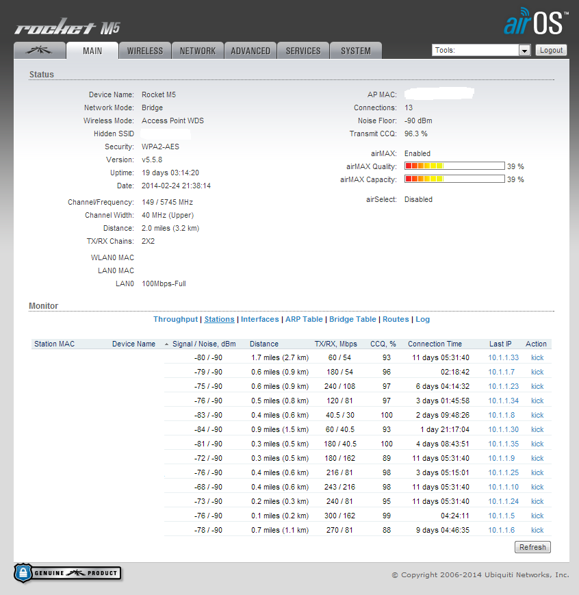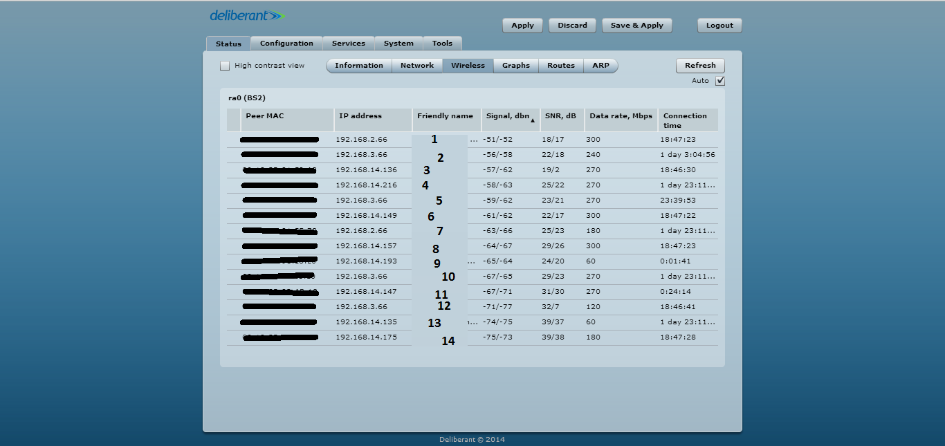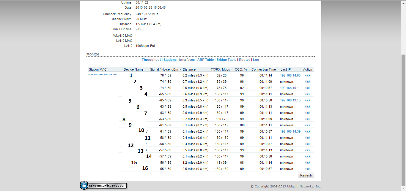 vladimir61rus Posted November 18, 2014 Posted November 18, 2014 (edited) Думаю для многих новичков будет полезная тема, правильная настройка базы на примере данного снимка, делимся коллеги опытом, какой клиент хорошо отображается, какой не очень. На сколько я знаю желательный сигнал dbn должен быть у точек доступа начинаясь от 60 и максимум 70, больше или меньше могут быть проблемы, некорректная работа. Мак адрес думаю всем понятно, ip понятно, сигнал dbn - уровень отображения сигнала на базе у точек доступа (как база видит клиентов), Data rate - пропускная способность точка-база (примерная) , snr db - ? Какой он должен быть ? (как я понимаю это горизонтальный и вертикальный уровень сигнала). Где не прав поправьте. Edited November 18, 2014 by vladimir61rus Вставить ник Quote