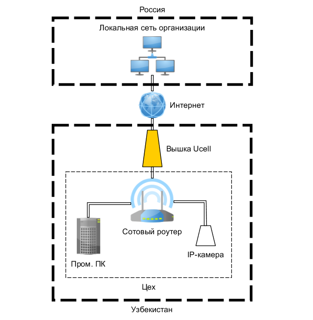Strohmann Posted November 20, 2014 Posted November 20, 2014 (edited) Добрый день, товарищи! Стоит задача организовать удалённый доступ из России к пром.ПК ("оранжевый ящик" для установки, Windows XP) и IP-камере, устанавливаемым в цеху предприятия в Узбекистане. Задачи удалённого доступа - редкие подключения для контроля работы оборудования, загрузка небольших архивов параметров с пром.ПК, возможно, загрузка записи с видеокамеры. Обязательным условием является высокая безопасность подключения и гарантия того, что посторонние люде не смогут подключится к этому каналу связи. Интернета в цеху нет, из сотовых операторов стабильную связь даёт только Ucell. Каким образом лучше всего решить эту задачу? Примерную структурную схему прилагаю. Есть идея использовать мобильный интернет и промышленный роутер, вроде Robustel R3000-3P. И какую-то из VPN технологий (OpenVPN?). С VPN до этого дела не имел, поэтому пока только вникаю. Боюсь, что могут быть проблемы с динамическим IP, предоставляемым Ucell, каким образом можно обойти этот момент? Использовать DDNS? Буду признателен за советы и критику. Edited November 20, 2014 by Strohmann Вставить ник Quote