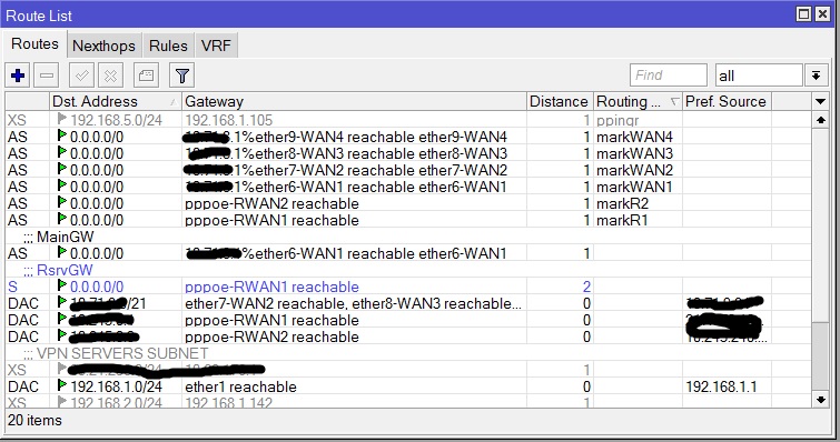 evgeny81 Posted November 23, 2014 Posted November 23, 2014 У меня 4 канала по dhcp от одного провайдера. Сначала маркируешь в мангле, а потом маленькая малоизвестная хитрость- в роутах направляешь на шлюз с добавлением имени интерфейса со знаком %. Вставить ник Quote