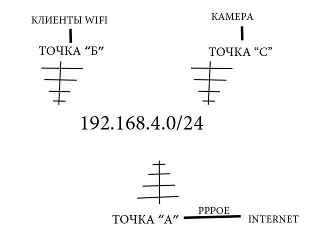 Niferman Posted December 4, 2014 Posted December 4, 2014 Подскажите как правильней будет организовать следующую схему. Имеем 2 железки Mikrotik SXT G-5HPacD и пара Dlink AP3200. Есть два здания (расстояние небольшое метров 700-900). Здание "А" есть канал от прова (PPPOE) и пара клиентов офиса. Здание "Б" клиенты офиса. Планируется здание "С" с одним клиентом. Планирую сделать так: "А" Mikrotik (в режиме роутера, т.к. надо к прову по PPPOE коннектиться) "Б" Mikrotik (в режиме моста) соеденить проводом с Dlink AP3200 для раздачи клиентам WiFi "С" Mikrotik (в режиме клиента - видеокамера) - буду покупать GrooveA 52HPn и соединять проводом с камерой. Вопрос заключается в том как правильней сделать что бы поменьше было маршрутизации и т.п. Вся сеть должна быть в одной подсети, допустим 192.168.4.0/24 Думаю может лучше точку "А" сделать бриджем а точку "Б" как роутер. Только вопрос как PPPOE будет подниматься... Чуть не забыл - на Микротике "А" еще нужны VPN 2 шт. Site-to-Site - но это уже второй вопрос. Чуть не забыл все это дело будет работать на 5Ггц - потому и нужны DLINK для клиентов, которые на 2.4Ггц работают Вставить ник Quote