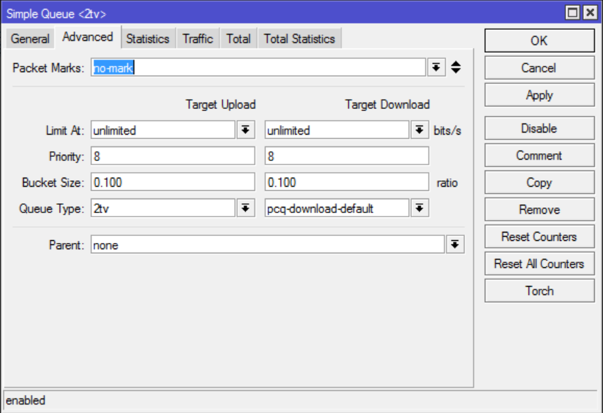 Морфеус68 Posted January 24, 2020 Posted January 24, 2020 3 минуты назад, kiragun сказал: Порт свич-группы самого Тика (2-5 ethernet)? Именно так! 4 минуты назад, kiragun сказал: Порт свич-группы самого Тика (2-5 ethernet)? Если да, то создаётся ограничение в "Queues" -> "Queue Types". Добавляешь новое, в строке "Kind" выбираешь "pcq". Указываешь ограничения, которые душе угодно. Затем во вкладке "Interface Queues" выбираешь нужный интерфейс, и в "Queue Type" выбираешь из списка свой свежепридуманный квос. Fin. И так пробовал… не стреляет! А HW Offload надо отключать для данного интерфейса? Вставить ник Quote